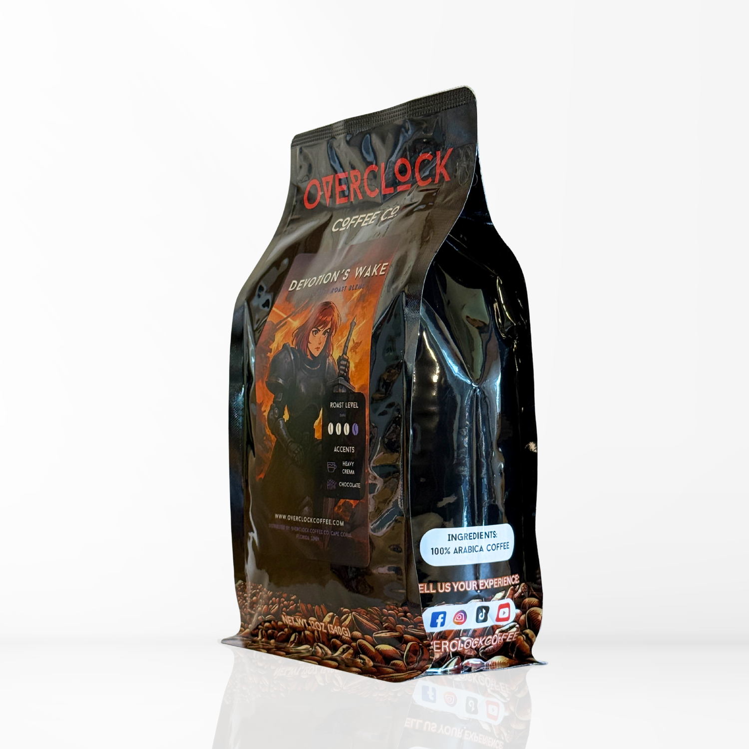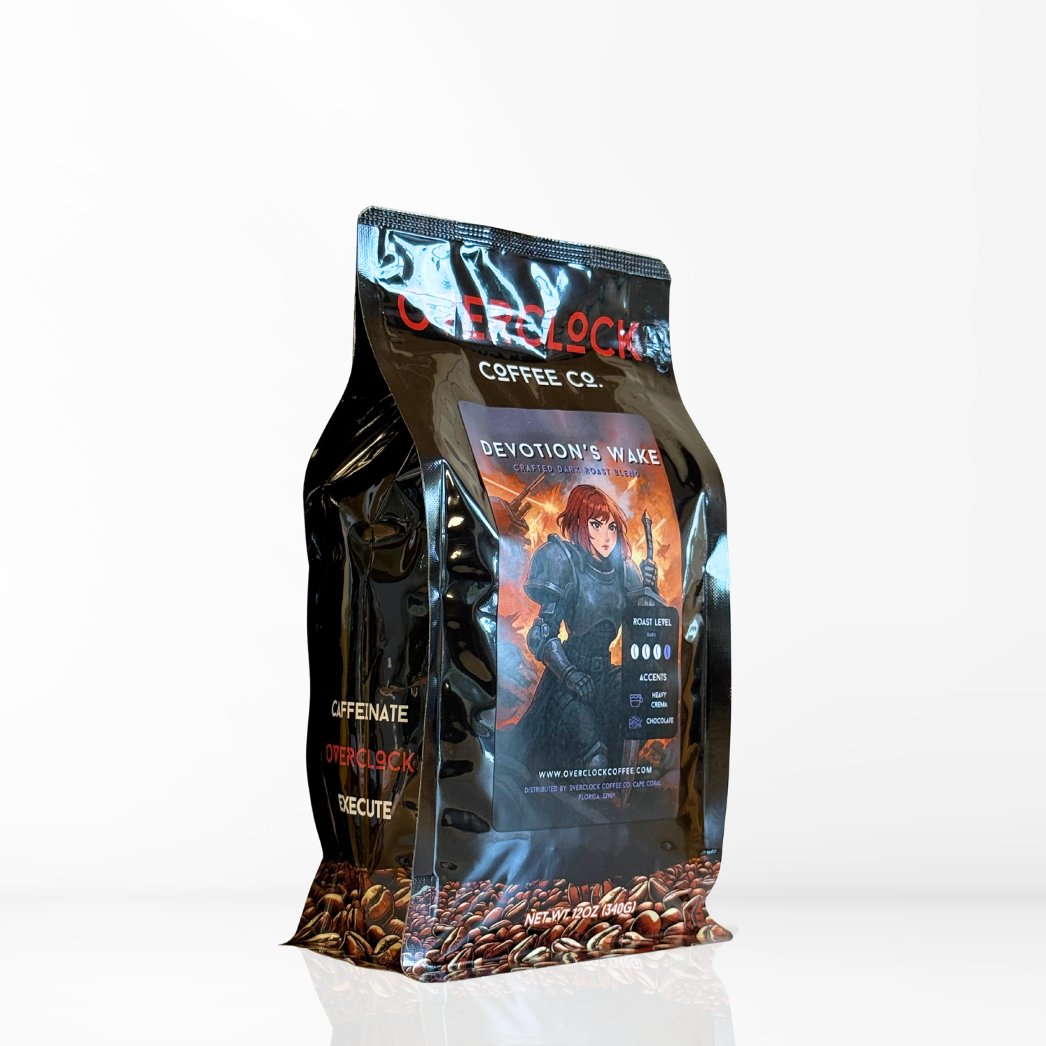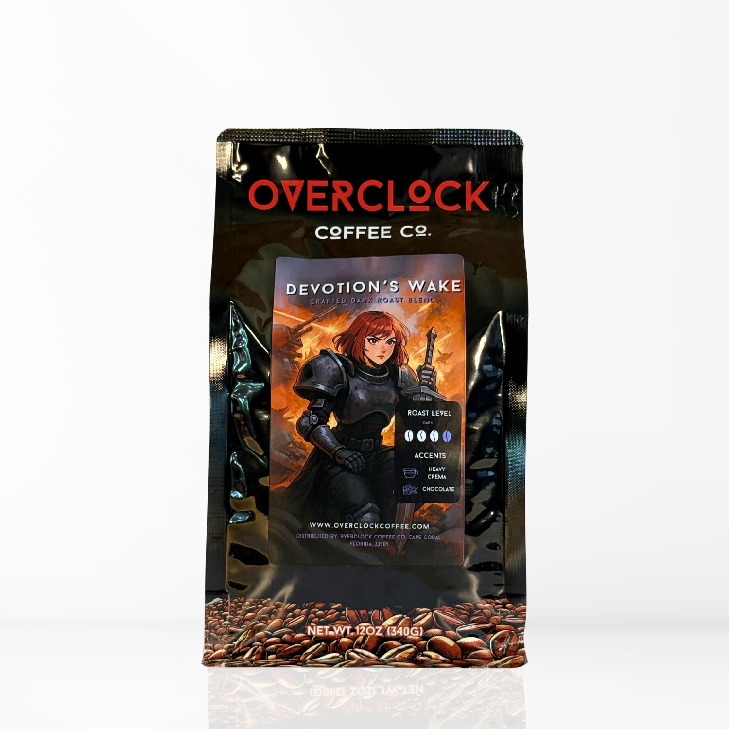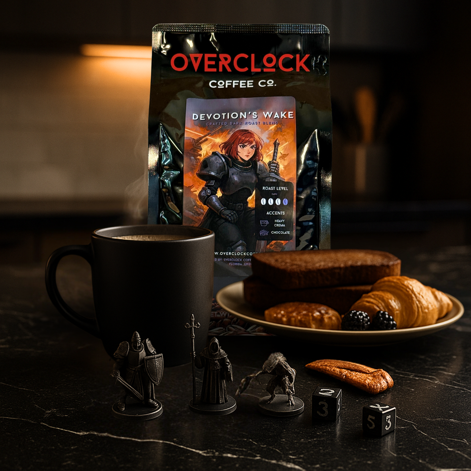 Devotion’s Wake is Overclock Coffee Co.’s crafted dark roast built for long campaigns, endless nights, and unbreakable resolve. With a full-bodied creaminess and layered chocolate depth, this blend carries the weight of duty and the comfort of strength. It’s a coffee forged for tireless spirits who rise with conviction and endure the dark.