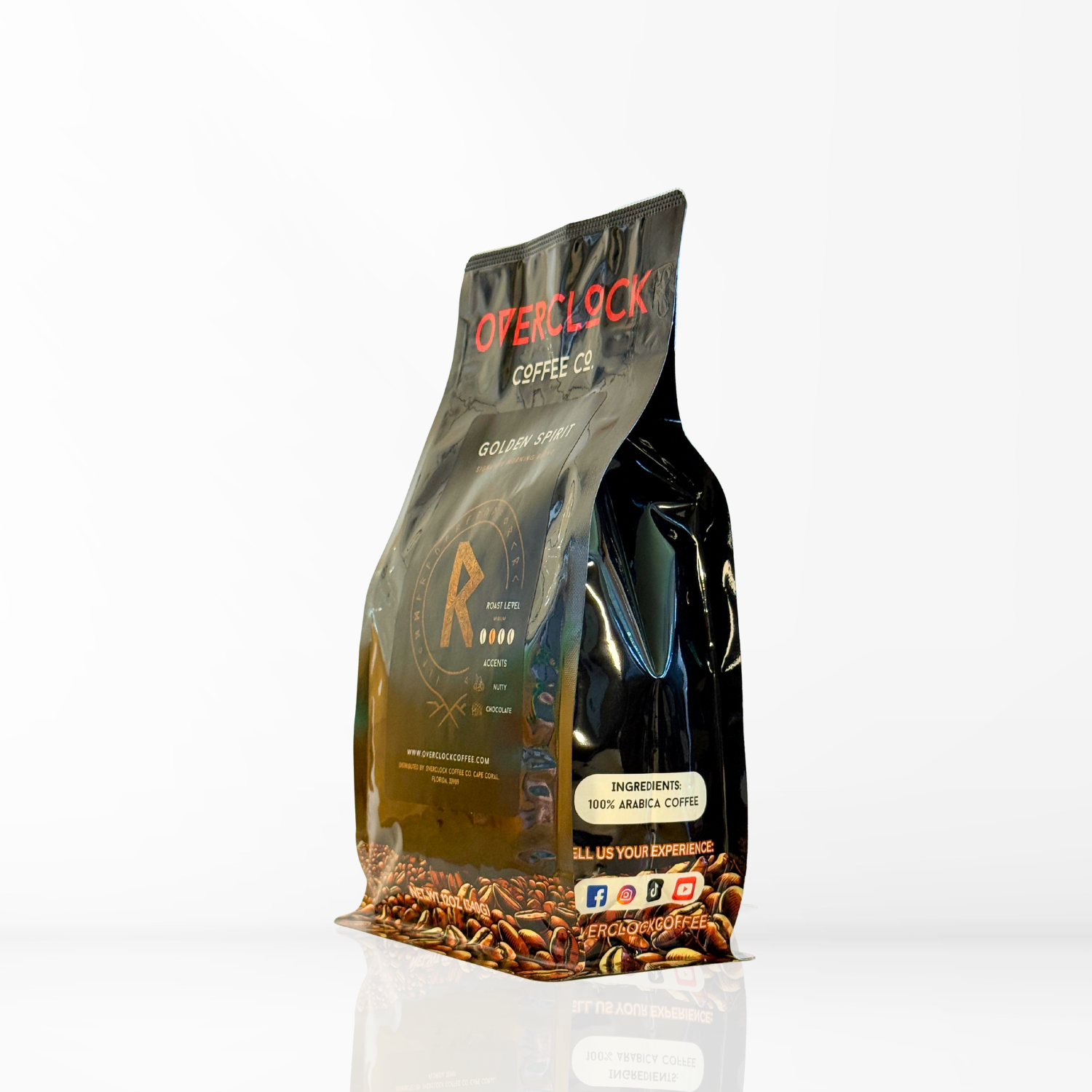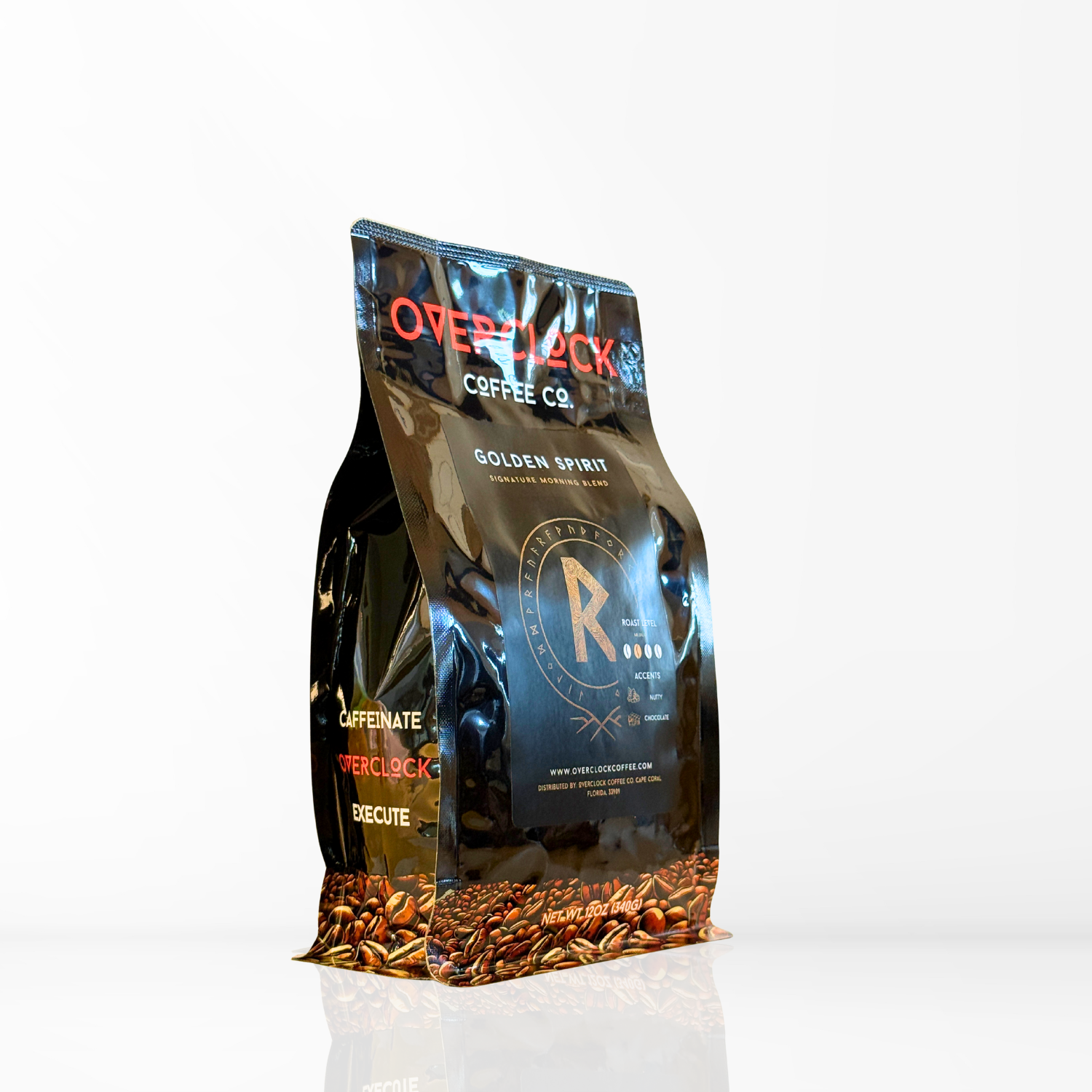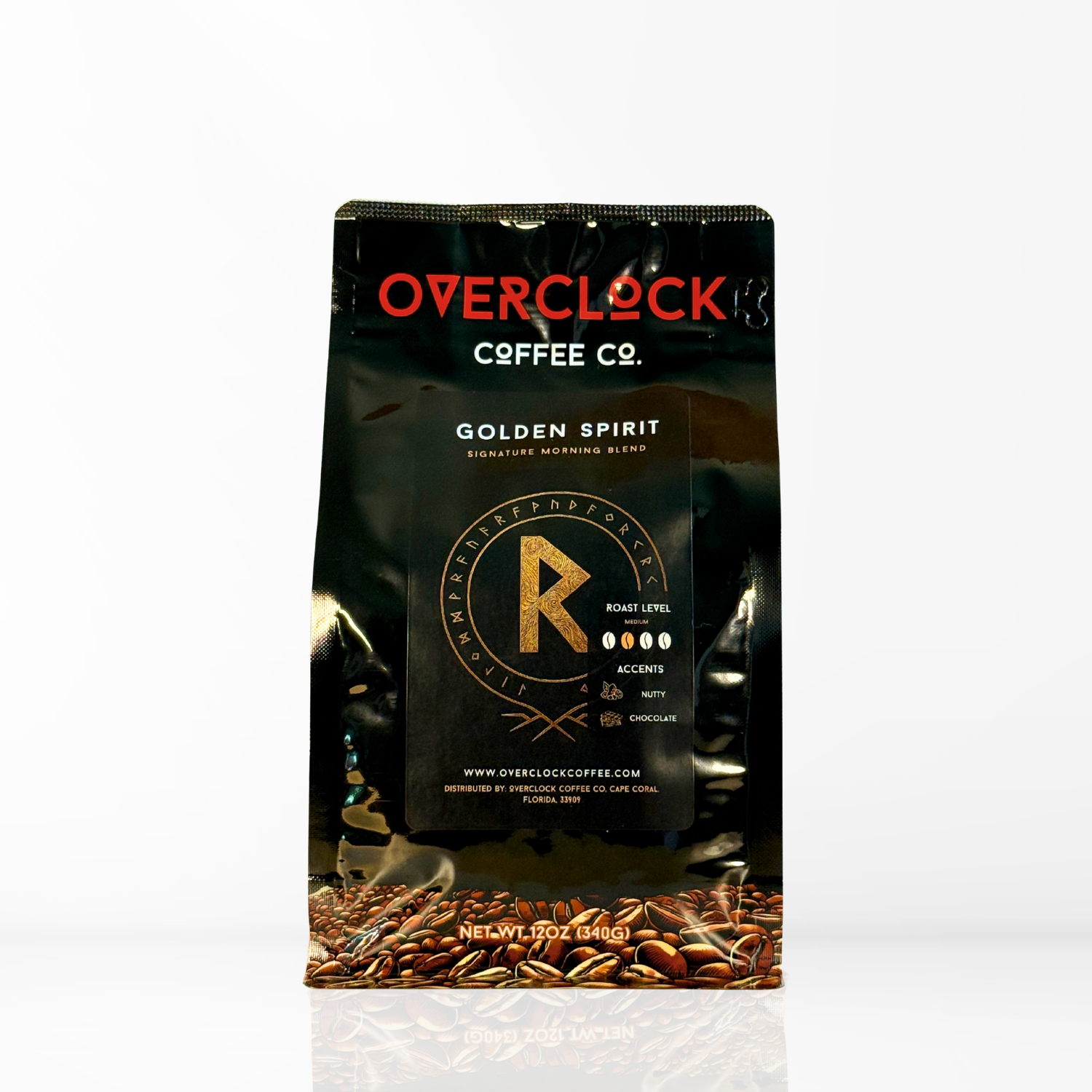 Golden Spirit is Overclock Coffee Co.’s signature morning roast from our Runic Collection. Crafted for early risers and relentless adventurers, this balanced blend brings warm nutty tones with smooth chocolate accents—fueling your day with clarity and focus. Designed to be your daily ritual, it’s a coffee that carries the spark of dawn and the strength of runes.