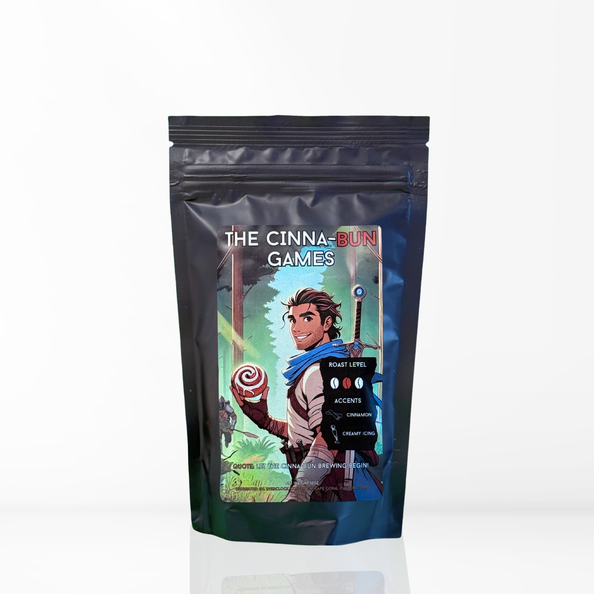 The Cinna-Bun Games is a gourmet cinnamon bun-flavored coffee designed for those who conquer mornings with strategy and style. Each sip blends warm cinnamon spice and creamy icing flavor into a nostalgic roast that’s smooth, sweet, and adventure-ready.